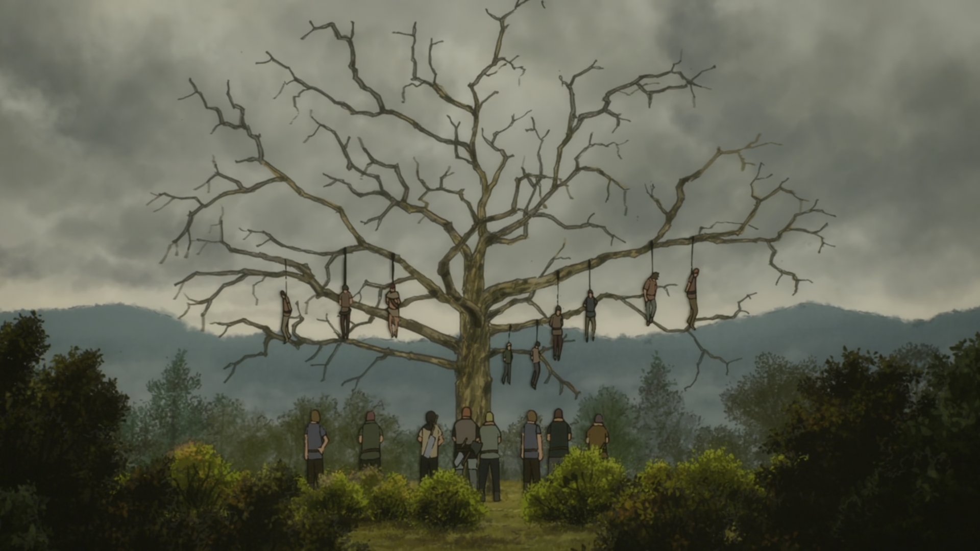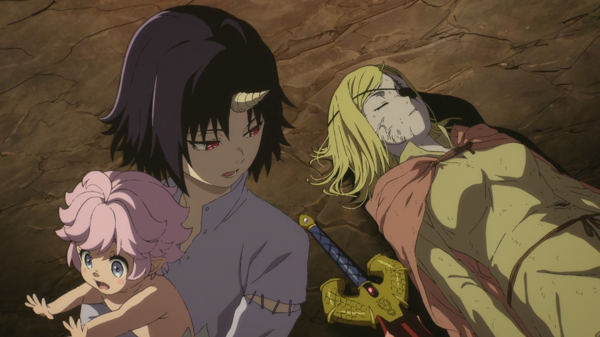 Гарне фентезі, досить жостке. Це ще одне намагання інтерпретації історії про класичних героїв і їхню місію. Тут конкретно вони повинні перемогти таких собі живих божеств, які тримають людство ну, по суті, в концтаборі (хоча і величезному, бо там аж 4 великі країни існують). Континент оточений з усіх боків, і ті ретельно охороняють свої володіння нікуди не випускаючи людей. Хоча до самих цих божеств добралась лише одна пачка героїв, за однією з яких ми і будемо спостерігати. Хоча недовго, бо пачка ця майже моментально соснула, той вовк з щупальцями всіх покрошив на вінігрет. і вирішив придушити майбутні намагання йому нашкодити в зародку, відправившись в столицю до короля який їх послав (і викував для них особливу зброю магічну) та влаштувати геноцид людства. в процесі там виникає сценка, де цього хаотік евіл божка (він до речі до цього особисто людей ніколи не бачив) бере на понт помираючий чел з лічинкою на руках, і в результаті ця істота полишає столицю з немовлям бо їй стало цікаво що ж виросте з нього і як це змінить начебто визначену заздалегідь долю. трохи притягнута за вуха мотивація, але виглядає досить логічно завдяки подачі атмосферно-драматичній. ну і божество це вирішило особисто дослідити людей таким чином. далі до нього доходить, що немовля треба кормити. тобто треба самка якась, згадує про вбиту ту героїню раніше, і робить з неї ходячий труп. але кормити вона не змогла, бо сама не народжувала ніколи, і так вони разом відправляються до людей в пошуках цицьки. істота та приймає людиноподібний вигляд, але шифрується, не використовуючи увідкриту свої сили. потрапляють в полон до бандосів через це, там знаходять кормилицю нарешті, тянку яка там виросла і яку ті бандоси пиздили і гвалтували (флешбеки її прям ніхуйно драматичні), через спілкування з чужаками ту ще і скормлюють ручному огру главбандоса. тут зявляється нова деталь сеттінгу, магія. вона перебуває в зачаточному стані і основана на використанні кристалів спеціальних. з них же король і кував у своєму горнилі (яке потім виявиться артефактом древніх зі своєю свідомістю) магічні мечі для героїв. незважаючи на примітивність ця магія все ж сильно заважала божеству, тому тянка-героїня без нього там част