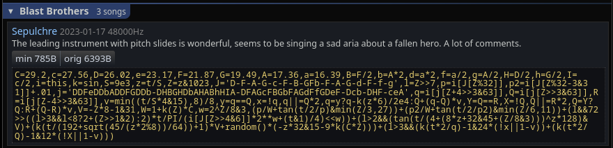 https://dollchan.net/bytebeat/#4AgCAO0eNVm1v2zYQ/q5fwQpxSsm0ZMmOHSdVim4NsABrN6wZsM01YFmibDYS5YpUHCPNf99Dym6yAQNmBXo53stzD++OSVd1q5Ol875pK/IhzTZCcnIjNW+2Dced3A+DiAzIak9uduld6wz+989ZMif0nduNUAR/KVGi2pac5CZUdQilN6kmaVnWO0UU/9pymQm5JrsNlyQXRcEbLjXJNqmUvISThhMu01XJ8wCe/+VMHHGbaPF7aDfpnmS11KmQxq2GhRWqLnDDoa1MBA4XZJtqOJCBc2MwqRoOs7LNOdxJvBe1iY88NvVOGkaWetPUu6XxLHTgOH/WLaK1ZU62rbbBDsBhDAncKFK0MtOilki3JvvvBkZxzQ8A120FTAqglCj3gfNTveP32IsN2CA3ZJPe847MPWkVz8l92gjDiQKGI917jhxkDYcN4Q+pZb5VBmrVTu5eK9Kkdq1Iq7pVxP1Yk59FJbQbEMPrioOedY3U/S1vCp5pn+yE3liEzWavN9Ur553hSNfP4OFekXbLrJbiYD4nSoI0xMt5hs0ouVzDCwB2Rjkxme3JKA7ODxaKULhVwO9C4JoAdrWoG9DsBeRTXfFdt32VMPoVJ3VB/kqzuwcEcj/sieQ7cK50Y5lMzQZY2Z6njRs4fug4K10XSZFcFb34bBJG8XQQMdCX6HDCqsSs0vnIB2M0Gg+HIZ31b3vn0SwOZzPP6xv5rXn1b3tV+kCDYcSyWlF62x9fj06hGHlhfD06qhq9OKQRnMTD8Xk4nXosilkUsWjIbq+uokmSTN/iZXox61MjmHqLoOF5m3FKU6aY8JKr1DqbxywOpixmo8XcaJ6djhZ+7PtUDKaI488jNjaruE/YNIhGbGIV1el04fnR9Qg4rkd93aPRmzfK83wbb3IlBrHnT0Lh+ef9KD73QEcY2nrLzSZs0ibP6pyj7FE7fNmV4wrbiiK0O/7Drx/Mzn5thUYZk7JGtWHbRZWWQRA41iyJx2fTCXNWCR0Gs9lsCty6Z5eAxKT3/dP3gzOAyDrNc6tI7VI49g7K2veNTp5QOvymw27Zn4y9XvzWur8w95H30jh+YTyGMeZOMnfm1YI58xUj9jo+jcw8s8N39kJmrhyX1XMgxfxptsmxw6kWFWcPzOby6BDTpuDRVGNChpcHAWoUn8ul+QbbZoSYIYfORdtu0Xfckt/KnDdKp2gow7TkD5pEMSkx9tD1xDQHRfMoTeZfmFiYfngIUPqN4Ip6NnwXDw2TgClAC+mByh4VQdeX3uV3vXsLU8yhv/j2bdgtdOj7iVntJAY+vpc/njx+ebogy2cHVbo1iZ08igCvlN6jfu+TRLZl+dZ1L9xfXC/Q9ScglGvqodS3ZZrxd2VJXYZr4HpPB2+g5TjVVu16vWdI+45j+B1rD8laUmo5qGpZqy0c5aBEamvfIcE9UO0KgOmQISuv7/7h9l9IIetH3sussPjPLGn3O3l0T1yDGEOSFmUN7tOVoiDFj89QXE+fpYX+5FjTZPlmcEzgS4st0pjeZbn/LE8eU3P+Gv0+FI0NTq+2kWRuqQ4fDhvDsLq4dJ6YY48cnBlSJ8OuQa/teRjmQplnd06Z1nTwcjgrk8hBj2AY/ndxwtHvUosS/Z7htCvEukUZAhwaeYfBjRpUut4ezzxSNHVFPqYfzYmi7PGiGLl5XZbd8QT1NLeVu9TLzhhOMIVN3EPpz+GdGbgLU2mmdyyq/nOKR4CGGFHQ54ROT61qL06S4bG6n836/ctniSXkuBsHdhHYkhmGv7XS1s7L/yNeWaqoZhgMrBtFfwM