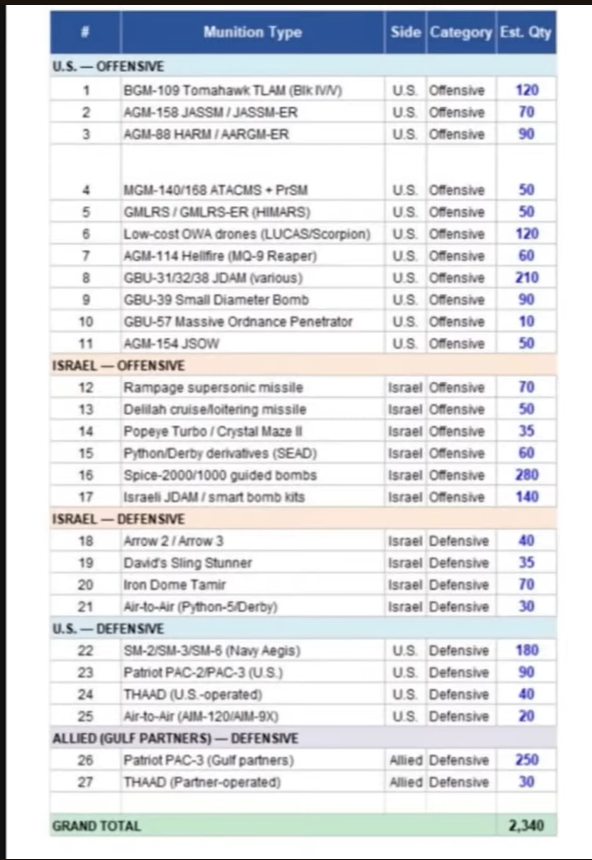 Оціночні кількості потраченого дальнобійного всякого (явреями та штатами, без арабських терпільних держав затоки) за 12 днів (доречі, сьогодні вже перевиконали "Народа як лев" по тривалості в днях). Доволі помірковані поки, топоров відстріляли мало, продовжувати можно ще до літа легко.