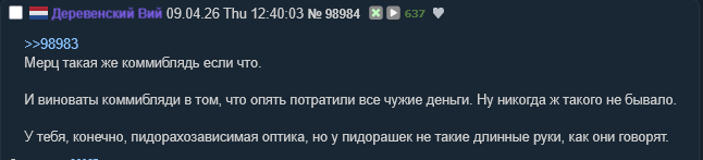 Грубоватый Хиппи 09.04.26 Thu 22:14:55 № 99156 Нахуй ты усыраешься за свой колониальный проект в стиле 19 века с бременем белого человека и т.д.? Я понимаю лахтынина, что всю жизнь слово в слово ту же залупу продвигала, ей платили. Понимаю на западе там аипак и прочие лобби группы тоже нормально отсыпают и даже методичку актуальную (нет) выдают, но в чём смысл эту тухлятину двигать бесплатно, шок.