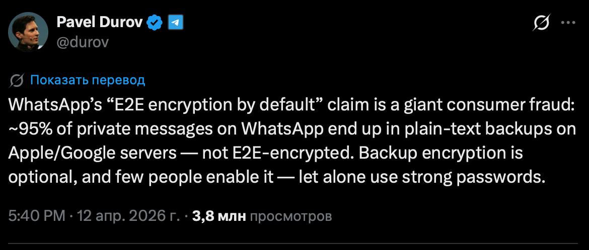 Злопамятный Рекламщик 12.04.26 Sun 21:51:52 № 99494 3 1646646963244.png(111.67KB, 1170x498) Что-то он расхрюкался. В WhatsApp, в отличие от ФСБграма, End2End шифрование по дефолту работает для всех чатов.