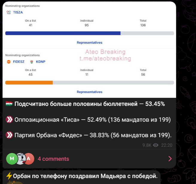 Специфический Шолотль 12.04.26 Sun 20:32:46 № 99490 Опросы, проведённые после закрытия избирательных участков в Венгрии ПРОГНОЗИРУЮТ (то есть это не точно) победу оппозиции.Но официально, пока, ничего не объявляли.