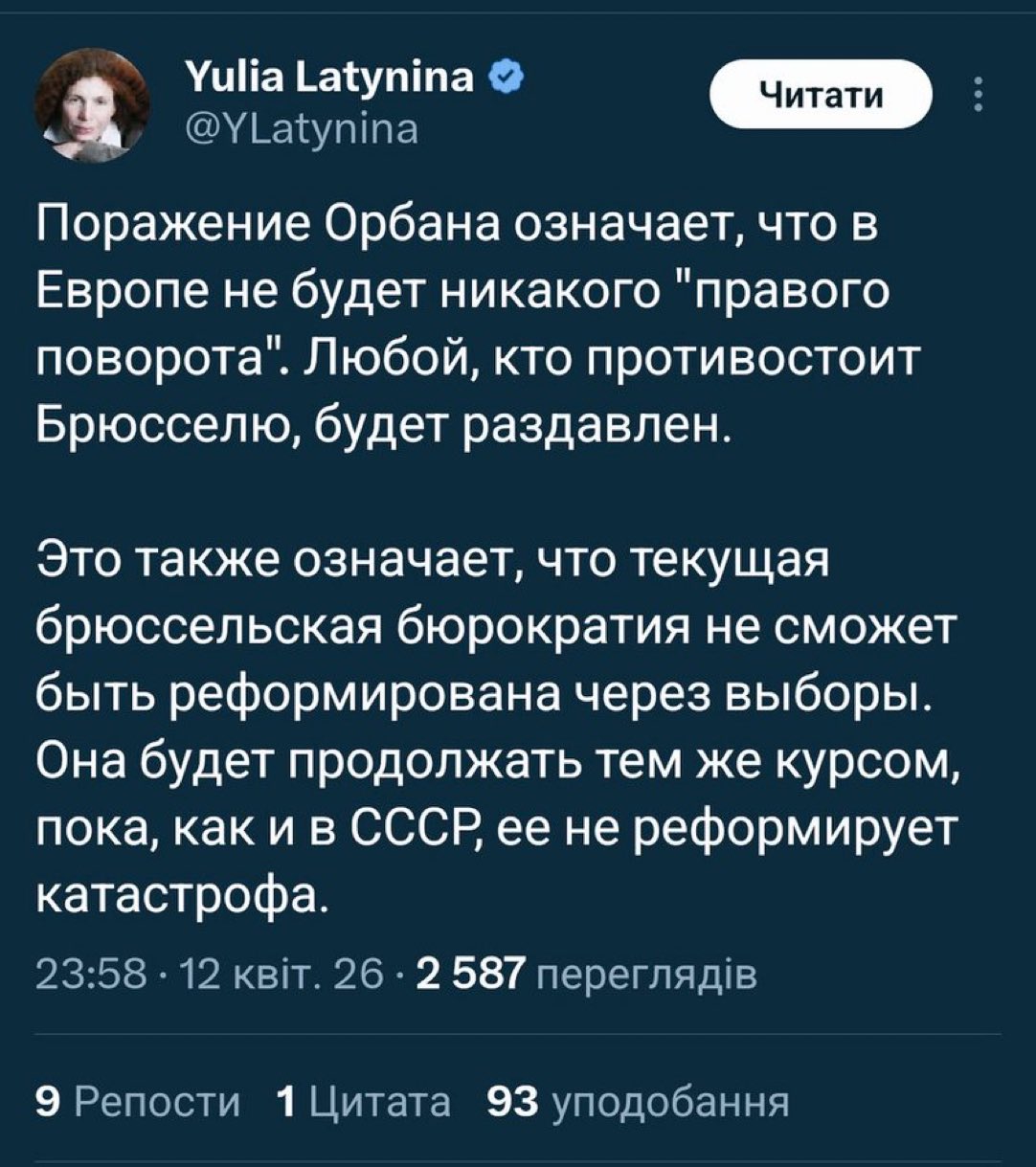 Бредовый Депутат 13.04.26 Mon 11:20:05 № 99527 2 >>99526>16 лет бессменной власти>БУДЬ ТЫ ПРОКЛЯТ, БРЮСЕЛЬ!Мало? Не хватило времени для реализации всех планов? 25 лет нужно было?Хотя, блядь, зачем я пытаюсь осмыслять посты Лахтыниной?