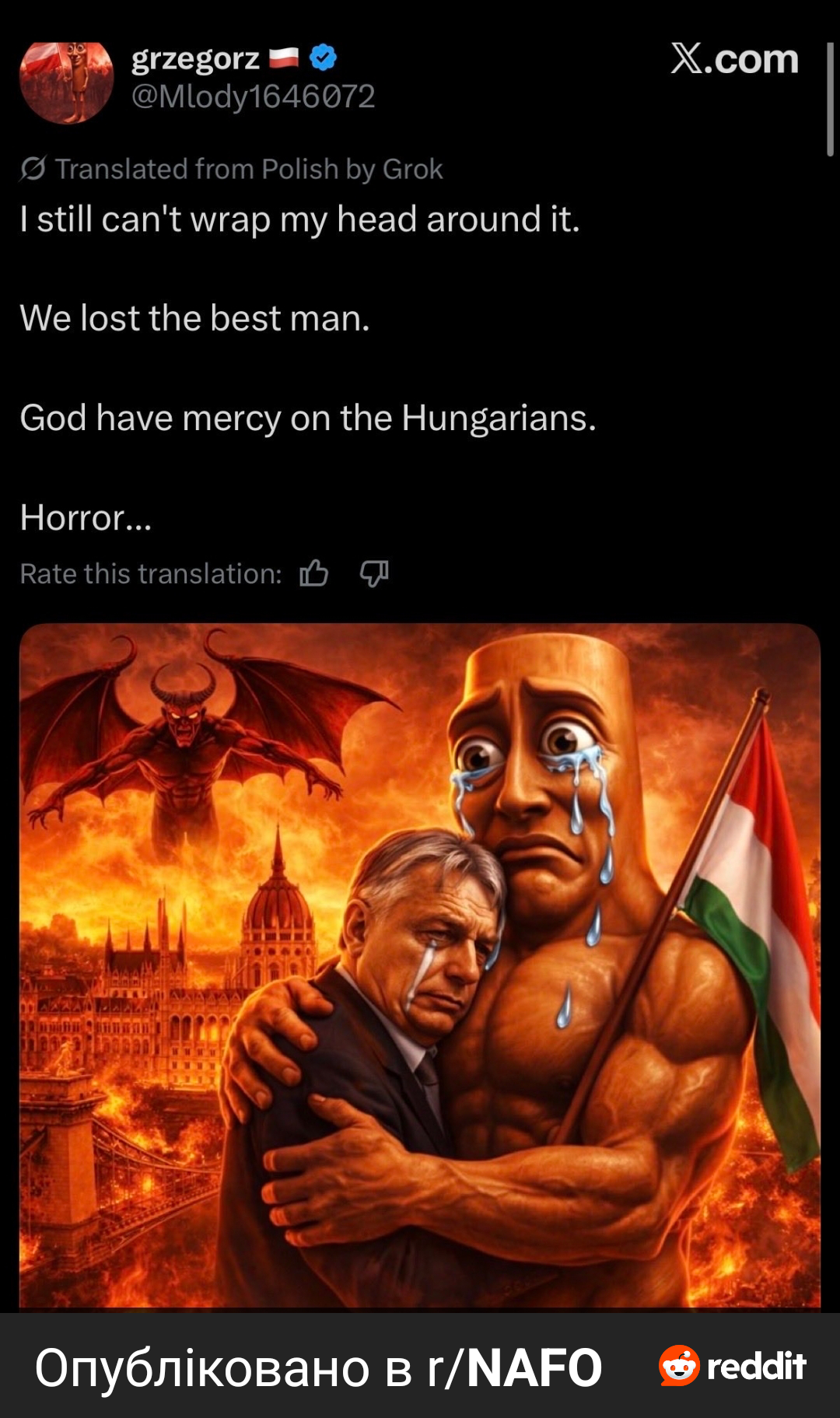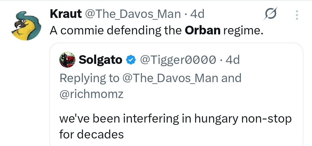 Грубоватый Хиппи 13.04.26 Mon 11:31:30 № 99530 Раздвоение методички.- Ничего не измениться, потому что Петер это буквально второй Орбан.- Венгрию теперь захватят толпы мусульманских мигрантов.Но вообще да, пытаться перебить вполне материальные проблемы типа бедности, культурным слопом с анти-воук виртью сигналингом, который всех заебал - годиться только для махания кулаками после драки.