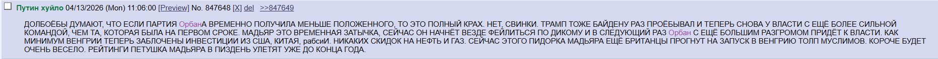 Специфический Шолотль 12.04.26 Sun 22:57:52 № 99498 1 >>99496Будут шатать, разжигать.-Выборы подделаны!-Президент не легитимный!-Украинские хакеры взломали выборы в Венгрии!