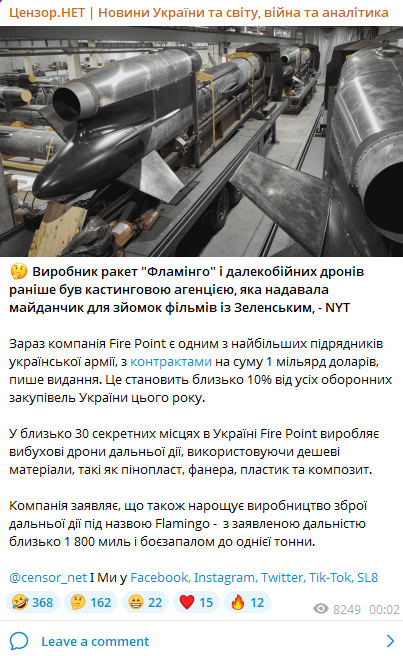 Ведущий производитель дронов в Украине Fire Point до войны был кастинговым агентством для проектов Зеленского, сообщает The New York Times.
