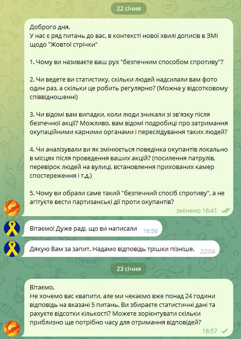 P.S: Вчора ми також надіслали 5 питань до руху, який позиціонує себе, як координаційний центр та куратори таких акцій. Станом на зараз минуло вже 24 години, як ми чекаємо відповідей. Також вчора в коментарях на фб ми отримали фідбек, що такі акції навіть емоційно не заряджають, а пригнічують, бо "ненасильницький спротив", який вони пропагують - це про безпеку для окупанта, а не про прагнення наближати перемогу.