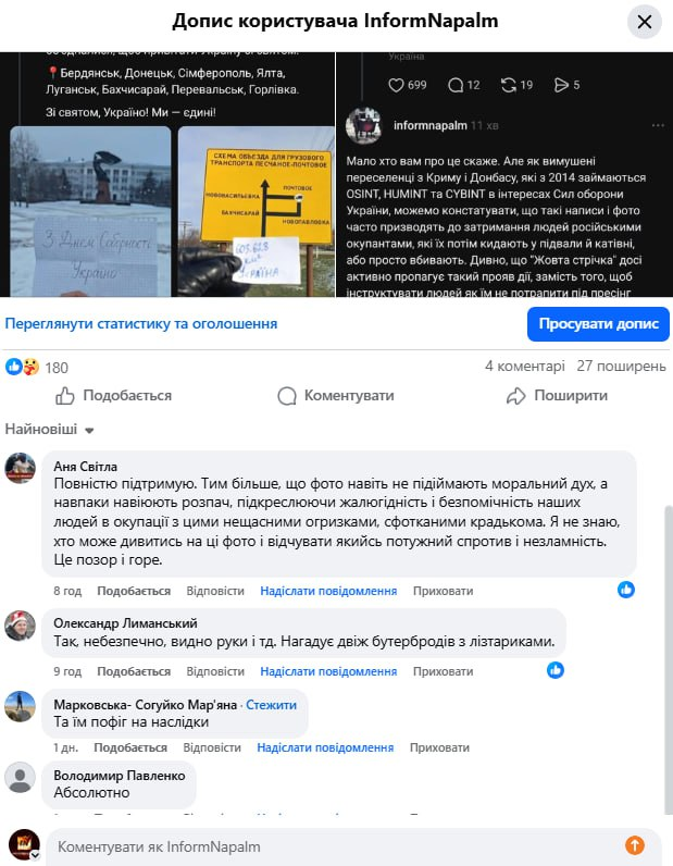 Проблема полягає не лише в окремих ініціативах, а й у тому, як ця тема "фоток з папірцями з окупації" подається публічно у медіа. Емоційні образи і гучні формулювання створюють хибне відчуття користі там, де насправді йдеться про ризики для конкретних людей і реальної роботи в тилу ворога.