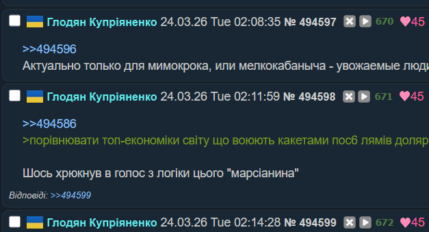 Глодян Купріяненко 24.03.26 Tue 02:11:59 № 494598 46 >>494586>порівнювати топ-економіки світу що воюють какетами пос6 лямів долярів - з україною у стані екзистенційної війни.Шось хрюкнув в голос з логіки цього "марсіанина"
