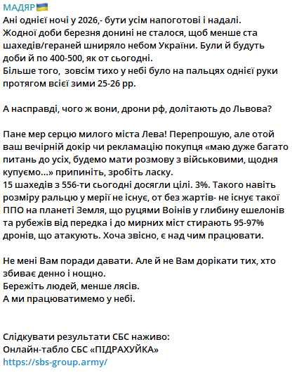 Не оценил пісюни Дій Петрусьов 25.03.26 Wed 13:52:54 № 494954 «У мене є дуже багато запитань до всіх. Тому що ми, як місто, щодня купуємо дрони, купуємо антидронні системи. Купуємо все, що нас просять, і передаємо. Ми левову частку бюджету міста витрачаємо на підтримку військових. Тому, думаю, що питань є багато до всіх. Моє завдання зараз — рятувати людей, щоб вони мали де переночувати, а в лікарнях надали якісну допомогу. Це ми зробимо», — сказав міський голова Львова.