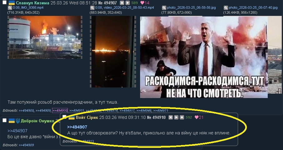 Магамир Гарбарук 25.03.26 Wed 18:44:07 № 495035 >>495034Самий піздєц в зоні БД та прифронт, уже навіть в ближній тил виїжаєш, думаєш чи йде ще вуйна чи ні, кабаки работають, барижні, туди сюди все.