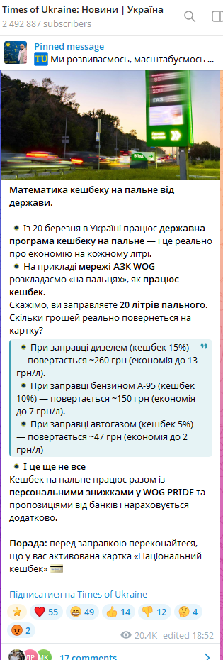 УВАГА Бахно Пильщик 27.03.26 Fri 18:58:45 № 495518 1 изображение.png(21.97KB, 301x203) изображение.png(164.15KB, 315x930) Математика кешбеку на пальне від держави.⭕️Із 20 березня в Україні працює державна програма кешбеку на пальне — і це реально про економію на кожному літрі.⭕️На прикладі мережі АЗК WOG розкладаємо «на пальцях», як працює кешбек. Скажімо, ви заправляєте 20 літрів пального. Скільки грошей реально повернеться на картку?⭕️при заправці дизелем (кешбек 15%) — повертається ~260 грн (економія до 13 грн/л);⭕️при заправці бензином А-95 (кешбек 10%) — повертається ~150 грн (економія до 7 грн/л);⭕️при заправці автогазом (кешбек 5%) — повертається ~47 грн (економія до 2 грн/л)⭕️І це ще не всеКешбек на пальне працює разом із персональними знижками у WOG PRIDE та пропозиціями від банків і нараховується додатково. Порада: перед заправкою переконайтеся, що у вас активована картка «Національний кешбек» 💳Підписатися на Times of Ukraine