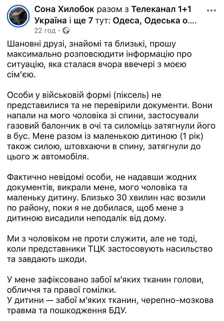 Милодар Гойло 27.03.26 Fri 19:35:58 № 495530 1 IMG_20260327_193452_973.jpg(155.12KB, 892x1280) IMG_20260327_193452_890.jpg(219.50KB, 960x1280) IMG_20260327_193453_466.jpg(40.83KB, 960x1280) У Одесі людолови силоміць запхали в бус чоловіка та його дружину з малою дитиною. Потім, поїздивши по місту, жінку з дитиною таки висадили. Але під час бусифікації, дитина отримала травму голови. Жінка травмована теж.