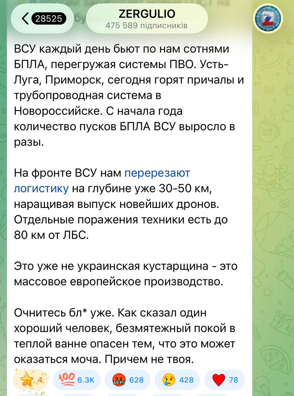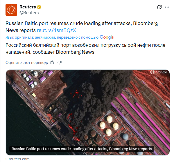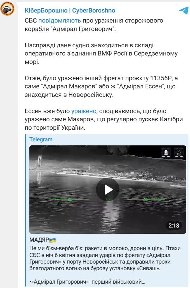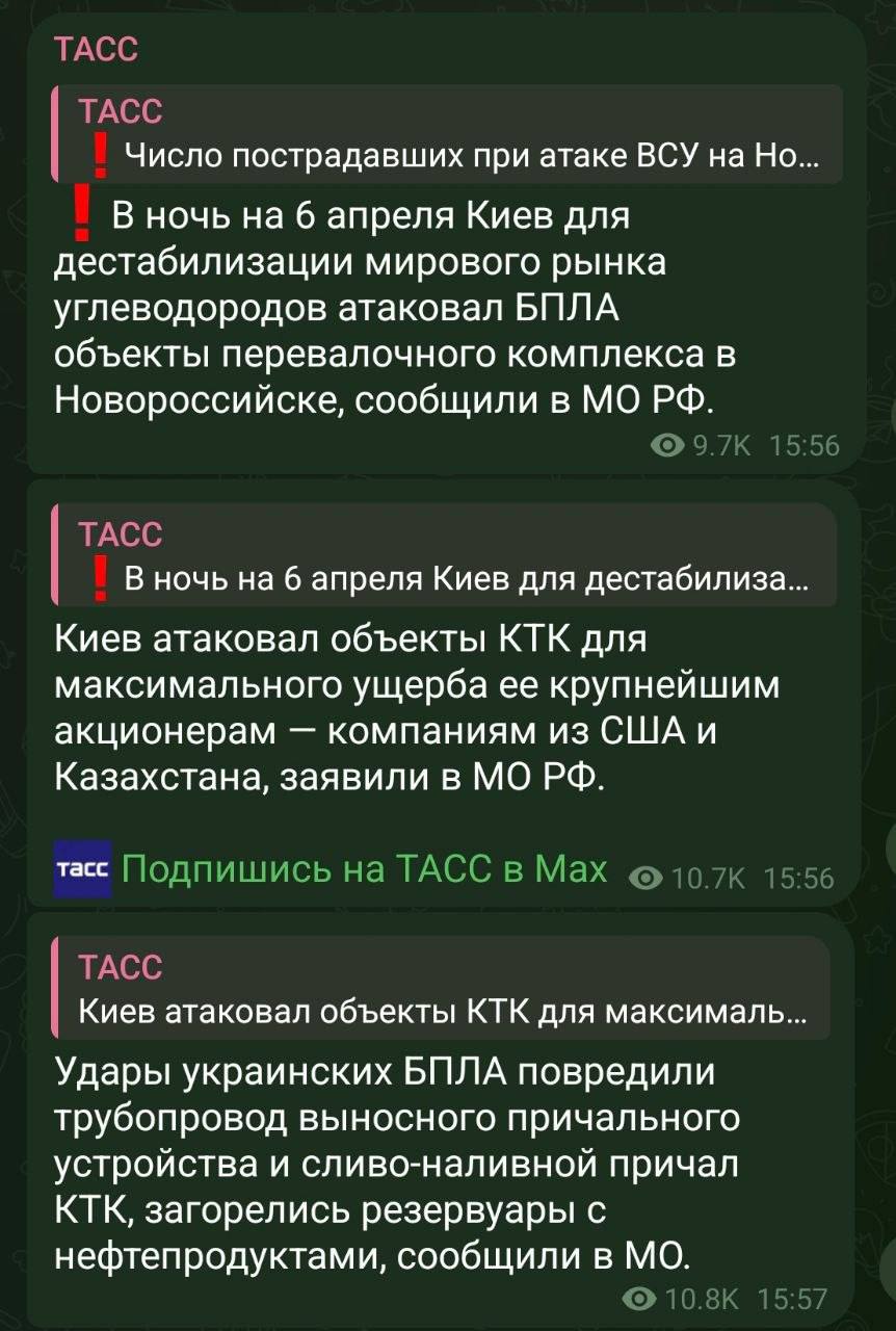 Сирош Марковецький 06.04.26 Mon 01:08:27 № 497837 2 photo_2026-04-06_00-25-28.jpg(135.07KB, 1251x1280) Аналіз результату атаки на нафтовий термінал «Шесхарис», Новоросійськ, 06.04.2026За наявними матеріалами в медіа зафіксовано влучання по трьох об'єктах:1) Причал №1, на ньому зафіксовано найбільш масштабне горіння через вилив нафти - 44.7034804,37.83587332) Причал №2 - 44.7061296,37.83954063) Вузли СИКН та запірна арматура трубопровідної системи, які контролюють роботу нафтоналивних причалів - вузлова інфраструктура, що забезпечує комерційний облік і розподіл потоків нафти між причалами - 44.7079664,37.8457369Пошкодження одночасно двох основних причалів і вузлів СИКН означає фактичну зупинку відвантаження.Економічний ефект атаки - пряме скорочення валютних надходжень від нафтового експорту, який є одним з основних джерел фінансування російської воєнної машини. Кожен день простою терміналу - це недоотримані мільйони доларів від продажу нафти.