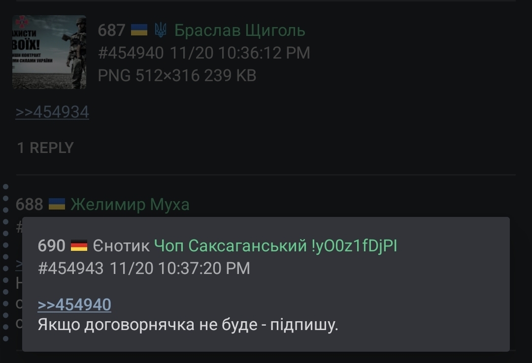 Пимен Скридло 03.04.26 Fri 12:38:35 № 497130 >>497122Ну якщо ти хочеш по закону, то твоя >повістка [вимога] про виконання обов’язку (обов’язків) військовозобов’язаним, резервістомвважається врученною коли у поштовому відділенні проставили відмітку про неможливість врученняhttps://zakon.rada.gov.ua/laws/show/3633-20