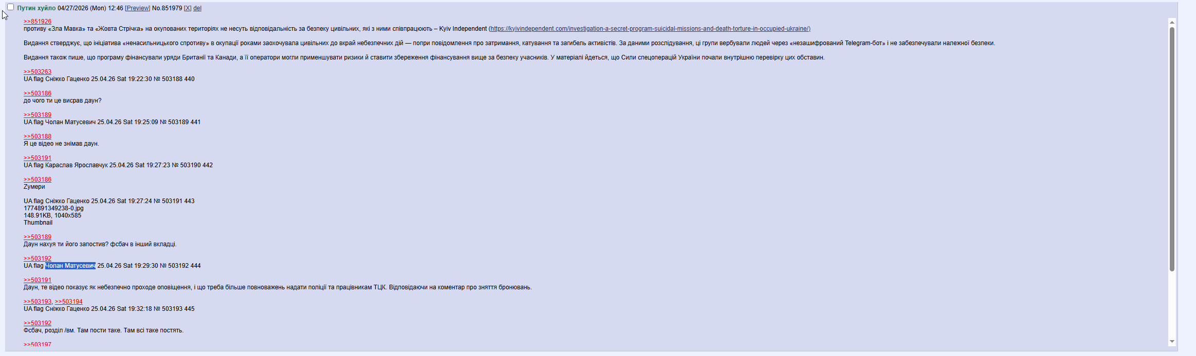 Караслав Ярославчук 23.04.26 Thu 16:05:48 № 502690 1 >>502687ну якшо сам пан буданов каже шо не існує то значить так і єтреба сплотіться вакруг нашого лідєранема зєленского - нема україни!
