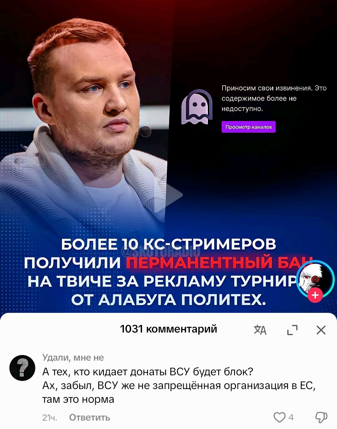 Бран Врублевський 26.04.26 Sun 10:39:40 № 503282 3 Мелочь а приятно.На твиче перебанили всех рекламщиком алабуги.Охуевшие пятаки рекламили свой террористической ВПК на американской площадке где-то год, и только сейчас в твич это заметил.