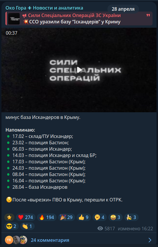 Злат Сандуленко 23.04.26 Thu 19:27:59 № 502751 5 image.mp41:58, 18.51MB, 1280x720 2 тора + оса, непоганоТри з чотирьох впольованих ЗРК знищено дронами В-2 загону «13» 414 обр «Птахи Мадяра» в ніч на 23 квітня.Пілоти загону «13» 414 обр СБС виявили 4 та знищили 3 одиниці ЗРК за одну ніч у ТОТ Донецької та Запорізької обл новими засобами MiddleStrike українського виробництва В-2 (бч 7-11 кг): два ЗРК «Тор-М2» та ЗРК «Оса».Запущені тричі ЗРК ракети не стали на заваді. Це тріо доповнило скарбничку квітня номерами 19,20 та 21 знищених Птахами Угруповання СБС протягом 01-23 квітня елементів ППО противника.Птахи 9 бату «Кайрос» 414 обр СБС пройшлися цистернами з пальним, маневровим та низкою складів МТЗ ворожої армії у ТОТ Донецької та Луганської обл. *загін «13»- новостворений у 414 тбр «Птахи Мадяра» юніт пілотів з існуючого складу 6 та 7 батів 414 обр. **тим часом пілоти 413 оп СБС «Рейд» вполювали та двічі задзьобали ще одного ЗРК «Тор-М2» у Брянській обл серед боліт Свинособачий Хуйлостан, таким чином рахунок квітня становить наразі 22 елементи ППО (відео у наступній нарізці).