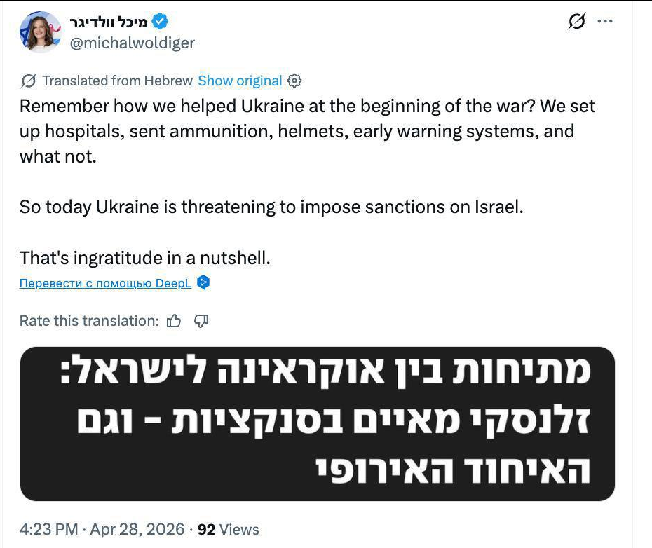 Жаданець Гасюк 27.04.26 Mon 18:01:48 № 503510 1 800px-Arestovych_rus.jpg175.48KB, 800x1132 >>503504>Честно говоря, это похоже на пощечину, учитывая стратегическую добрую волю, которую Украина проявляла — от признания КСИР террористами до криминализации антисемитизма. Получать прибыль от украденного груза — ниже достоинства Израиля>По состоянию на 2026 год Израиль официально не признал Голодомор 1932–1933 годов геноцидом украинского народа