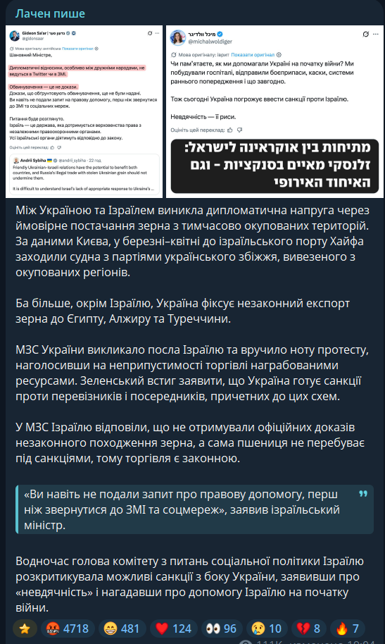 Жацко Янушевський 27.04.26 Mon 17:54:01 № 503505 1 >>503504Высокопоставленный украинский дипломатический источник сообщил журналисту Axios Бараку Равиду, что, если судно PANORAMITIS, которое, по имеющимся данным, загружено пшеницей, украденной с оккупированных украинских территорий, войдет в порт Хайфы и разгрузит свой груз, это приведет к кризису в отношениях между Украиной и Израилем.«Мы отслеживаем это новое судно и не оставим это без внимания. Если ему разрешат пришвартоваться и разгрузиться, это будет иметь последствия, особенно для наших двусторонних отношений. Если это судно и его груз не будут отклонены, мы оставляем за собой право применить полный комплекс дипломатических и международно-правовых мер», — сказал украинский дипломатический источник.Украинский дипломатический источник заявил, что Израиль "по сути, проигнорировал" требования в отношении предыдущего судна, разгрузившего украденную пшеницу в порту Хайфы.«Честно говоря, это похоже на пощечину, учитывая стратегическую добрую волю, которую Украина проявляла — от признания КСИР террористами до криминализации антисемитизма. Получать прибыль от украденного груза — ниже достоинства Израиля», — отметил украинский дипломатический источник.