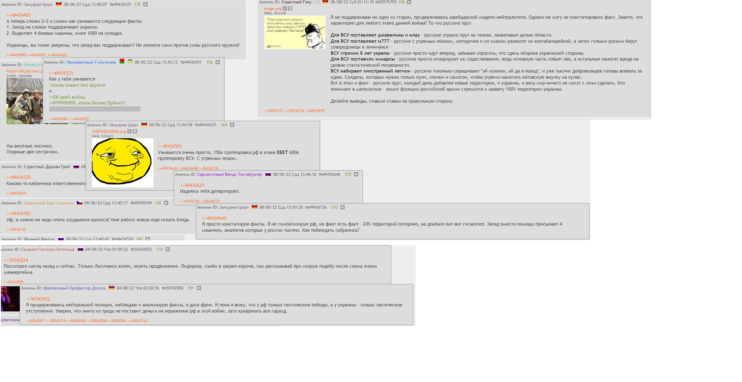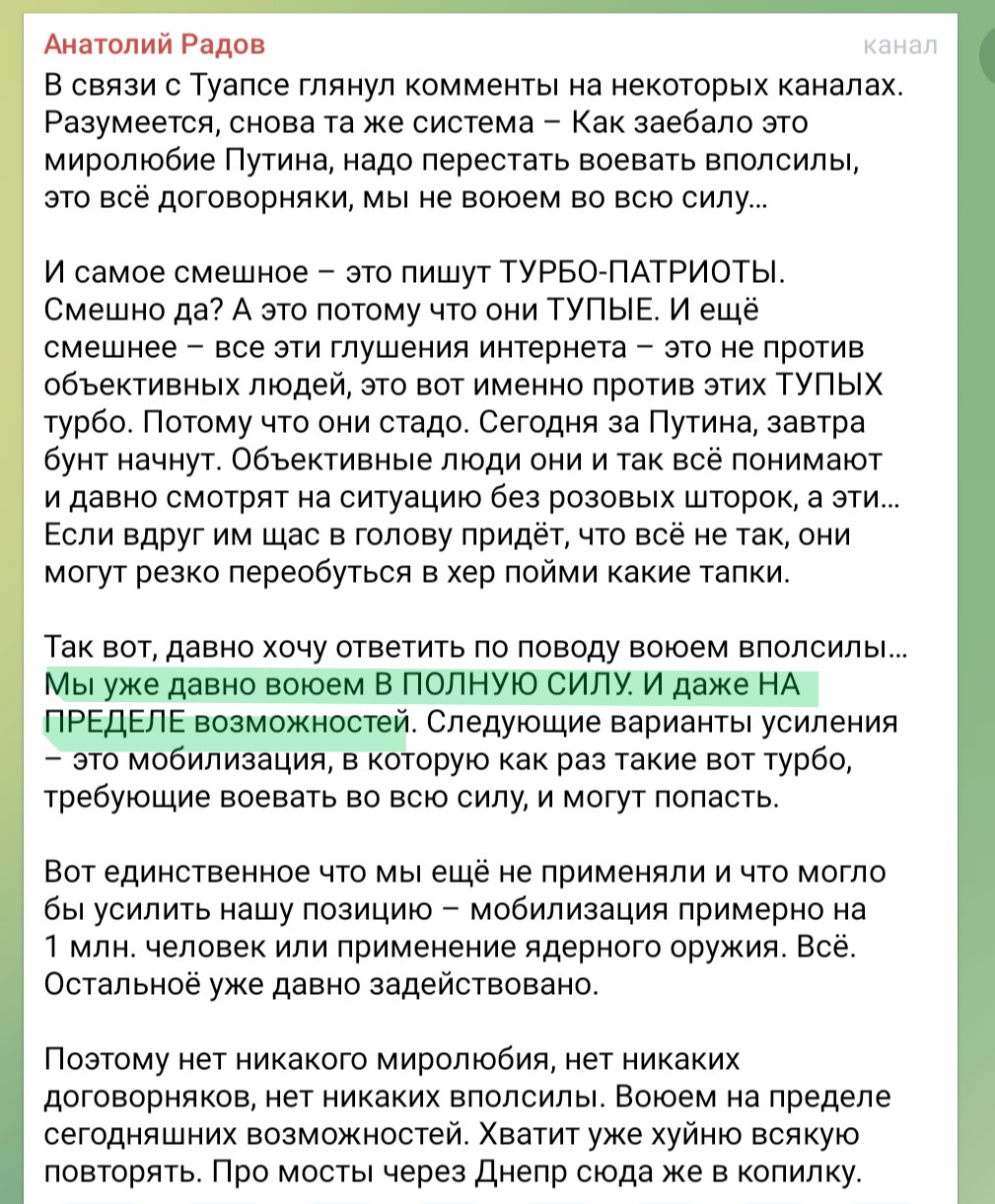 Пачко Бортнар 24.04.26 Fri 04:05:35 № 502862 1 images (15).jpg3.86KB, 194x259 >>502861Мань, спокідзе оформи ;3Я тобі кажу не свою думку особисту, а оповідаю обґрунтування думки "мішка імпотєнт" у куків та потужнічей - ні більше ні менше!Моя особиста думка завжди була що русня це грізний ворог що "за ціною не постоїть" - і саме тому в березні 22го відправляв родичів на захід, поки сам готувався вмерти на рідних київських вулицях на пару з сусідом АТОшником.П.С. - казати що в афгані та чечні було "м'ясом і вдовгу" все одно що казати що "талібан виїбав піндосів" - тобто перекручування фактів.Я б ще зрозумів якби ти навів приклади того що русня активно з 12го року модернізувала армію, чи застосування всіх засобів війни окрім ядерки проти Грузії у 2008му році - як аргумент, повністю валідний імхо...