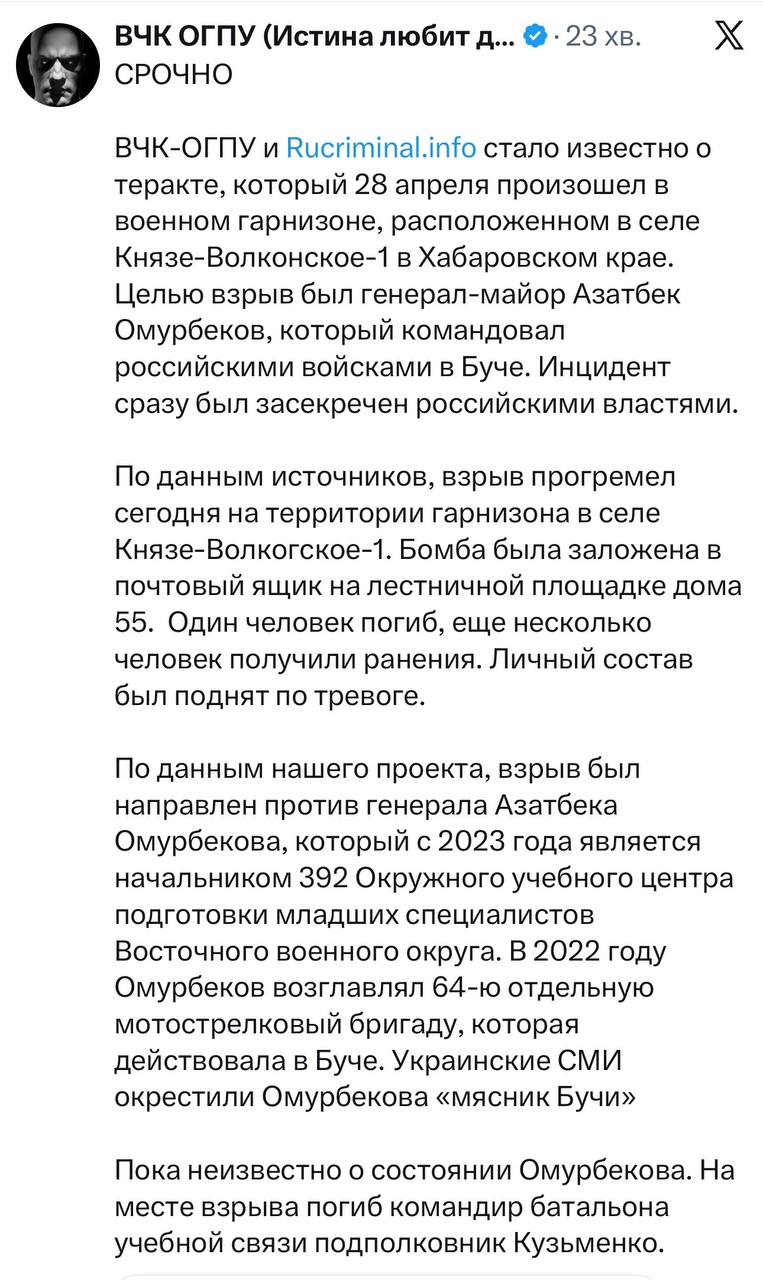 Злат Сандуленко 24.04.26 Fri 21:54:18 № 503000 3 💥Удар по базе ФСБ.В ночь на 23.04.2026 был нанесен удар по расположению базы подразделения ФСБ Пыническая Рухнумия в н.п. Счастливцево, Генический район, Херсонская область.Подразделение размещалось на территории пансионата «Экспресс».Атака совершена с использованием ударных БПЛА.Вследствие атаки:• Уничтожено пять зданий, использовавшихся в качестве мест проживания;• Столовая;• Оружейная;• Уничтожен склад с БК;• Сгорело 4 автомобиля;• 2 сотрудников – 200, 10 – 300.@dosye_shpiona